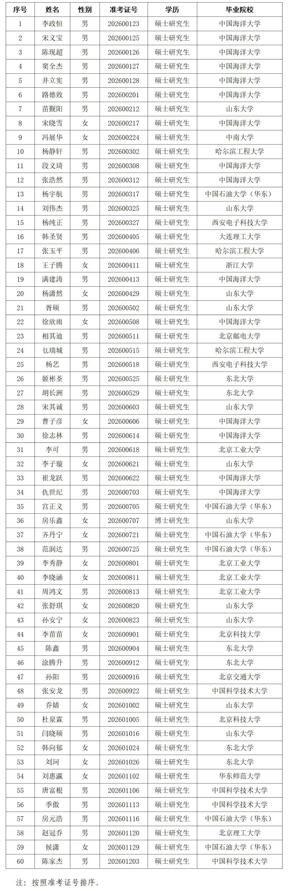 根据《山东省农村信用社联合社2026年度信息科技类应届毕业生校园招聘公告》,李政恒等60名考生通过笔试、面试和体检等程序,进入背景调查环节,现予以公示。公示期间,如有问题,请向我单位反映。